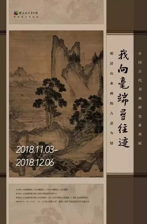 “我向毫端寻往迹--明清山水画的古意今情”于2018年11月3日至2018年12月6日在北京画院美术馆三、四层展厅举行。展览共汇集国内重要文博机构收藏的三十五位书画家的逾五十件明清诸派的摹古佳作,为观众集中了解中国古代书画的摹古与出新提供了一次宝贵的机会。