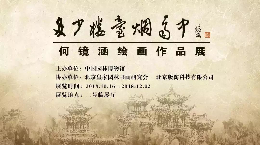 “多少楼台烟雨中--何镜涵绘画作品展”于2018年10月16日至2018年12月2日在中国园林博物馆 二号临展厅举行。此次展览将通过60幅以楼阁山水及古装人物为主要题材的何镜涵先生的原作,向世人展示自然山水与人文景观高度融合的中国古典园林艺术。古典园林与水墨园林这两大传统艺术巧妙地融合在一起,相互促进,砥砺发展,在向社会普及传统园林知识,这对提升大众对水墨园林的鉴赏水平都有着深远的意义。