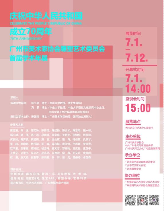 由广州市美术家协会,广州市天河区文化广电旅游体育局主办;广州市美术家协会雕塑艺术委员会,广州市天河区文化馆,广州市雕塑学会承办;广东省陈设艺术协会公共艺术分会与广东省青年美术家协会雕塑艺术委员会协办的“庆祝中华人民共和国成立70周年——广州市美术家协会雕塑艺术委员会首届学术年展”将于7月1日在广州市天河区文化艺术中心开幕。本次展览将持续到7月12日。