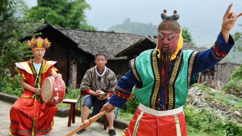 家住贵州省德江县枫香溪镇长征村的王国华受父亲影响,十余岁就迷上了傩面具雕刻,现在是德江傩面具制作工艺省级代表性传承人。制作一件德江傩面具,需经过选料、下坯、放线、粗雕、精雕、刮灰、上色等20多道工序。
