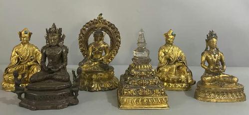 其中,5件金铜佛造像和1件铜鎏金水晶嵌宝石供养塔制作工艺精良,专家建议暂定为三级文物。特别是1尊明末清初的黄铜同侍从无量寿佛造像,呈现出显著汉藏融合风格,其六面形台座多见于汉藏风格唐卡与壁画,在铜造像中较为罕见。