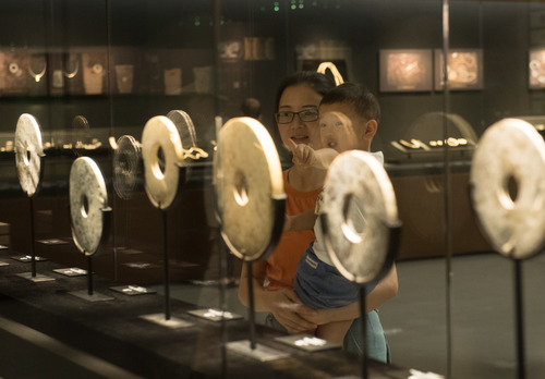 观众在良渚博物院观看出土的玉璧。2019年7月,良渚古城遗址获准列入《世界遗产名录》。(新华社记者 翁忻旸 摄)