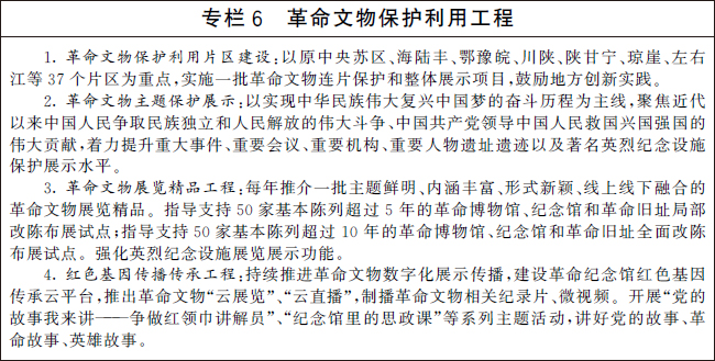 提升革命旧址开放水平,完善重要革命纪念地设施。用好革命文物资源,举办国家和群众性纪念活动,积极开展青少年教育活动。创新革命文物宣传传播方式,加强革命文物资源网络空间建设。依托革命文物资源开辟公共文化空间,发展红色旅游及红色研学旅行,打造红色经典景区和精品线路,助力乡村振兴和革命老区振兴发展。