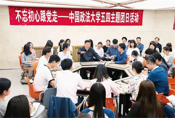 2017年5月3日,中共中央总书记、国家主席、中央军委主席习近平来到中国政法大学考察。这是习近平在学生活动中心参加民商经济法学院本科二年级2班团支部开展的“不忘初心跟党走”主题团日活动。 新华社记者 王晔/摄