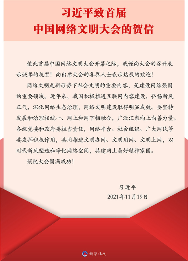 习近平在贺信中强调,网络文明是新形势下社会文明的重要内容,是建设网络强国的重要领域。近年来,我国积极推进互联网内容建设,弘扬新风正气,深化网络生态治理,网络文明建设取得明显成效。要坚持发展和治理相统一、网上和网下相融合,广泛汇聚向上向善力量。各级党委和政府要担当责任,网络平台、社会组织、广大网民等要发挥积极作用,共同推进文明办网、文明用网、文明上网,以时代新风塑造和净化网络空间,共建网上美好精神家园。