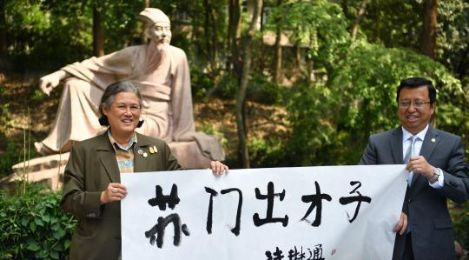 4月8日,正在四川访问的泰国公主诗琳通来到眉山市,参观三苏纪念馆和三苏祠。三苏祠是中国北宋著名文学家苏洵、苏轼、苏辙父子的故居。结束参观前,诗琳通还为三苏祠题写“苏门出才子”毛笔字。