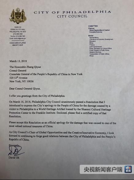 美国费城就中国兵马俑展品被损坏事件书面道歉