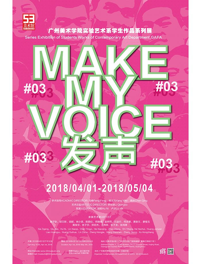 发声 03”是广州美术学院实验艺术系联合教学基地53美术馆共同举办的展览。本次展览是实验艺术系教学脉络和成果的再次呈现。展览时间为:2018年4月1日-5月4日。