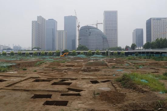 2018年8月11日,北京,奥林匹克中心南侧两处大型古代墓葬群,附近有施工队正在施工。其中的一个墓坑内还有骸骨,也有墓坑内留有罐子等物品。墓坑的排列并没有规律,有的呈南北或东西向,有的则是倾斜排列。墓坑总体较浅,且基本都为土坑。