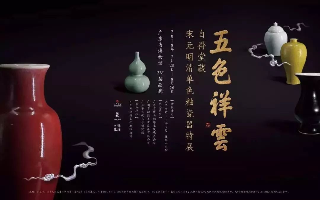 “五色祥云--自得堂藏宋元明清”于2018年7月28日至2018年8月26日在广东省博物馆3M层画廊举行。此次展览共展出68件(套)宋元明清单色釉瓷器精品,是由广东省博物馆事业发展基金会特邀国内知名古陶瓷专家从自得堂藏品中精选而来,器型多样,釉色丰富,展示了宋元明清单色釉瓷器的独特风采。本次展览旨在向观众提供一次较全面欣赏中国古代单色釉瓷器的机会,使广大瓷器爱好者对中国瓷器有更深的理解。