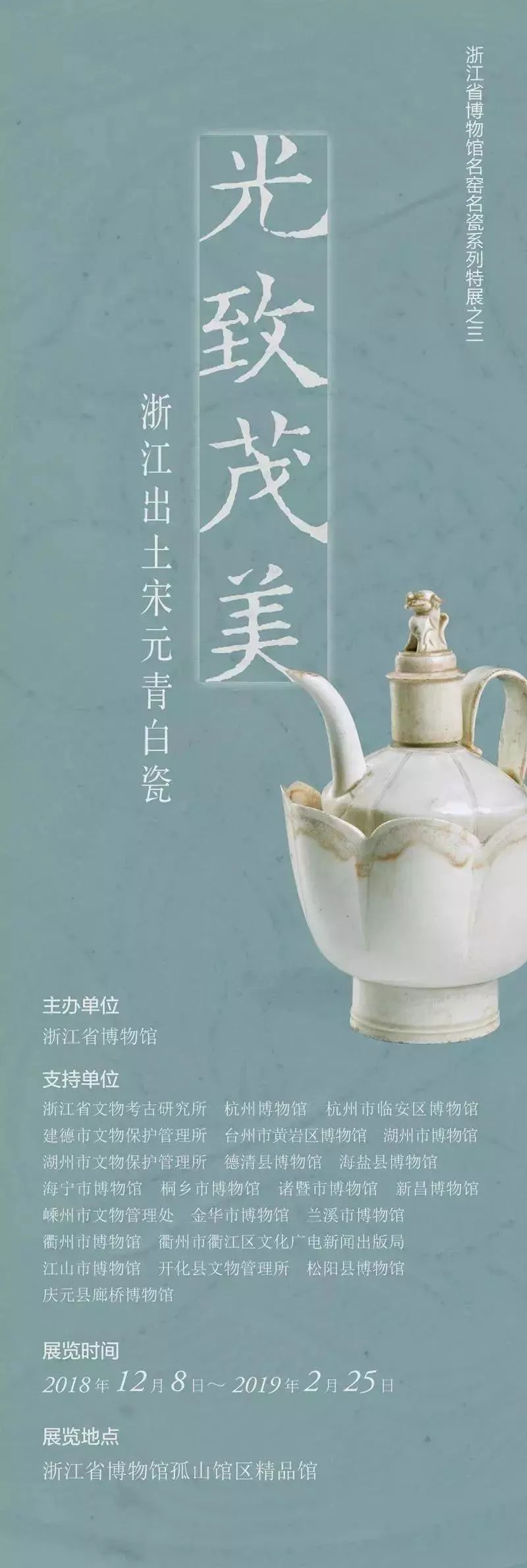 “光致茂美--浙江出土宋元青白瓷”于2018年12月08日至2019年02月25日在浙江省博物馆孤山馆区精品馆举行。本次展览是继“澄泥为范--河南新出宋金名窑瓷器展”“琼姿玉骨--明清德化白瓷精品展”之后,浙江省博物馆推出的第三个“名窑名瓷系列特展”,也是浙江省内出土青白瓷器的首次集中亮相。