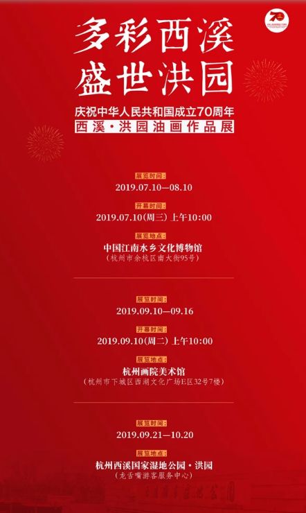 2019年是中华人民共和国成立70周年,也是全面建成小康社会,实现第一个百年奋斗目标的关键之年。为隆重庆祝新中国成立70周年,以油画的艺术形式生动展现西溪湿地秀美的自然风光和浓郁的民俗特色,杭州市文学艺术界联合会、余杭区人民政府联合主办,杭州市美术家协会、杭州画院、余杭区文学艺术界联合会、杭州西溪湿地公园(余杭)管理委员会办公室共同承办了“多彩西溪·盛世洪园-庆祝中华人民共和国成立70周年西溪·洪园油画作品展”。本次展览时间为7月10日至8月10日。