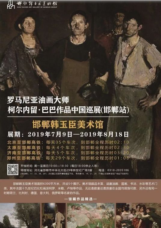2018年是罗马尼亚人民庆祝国家统一100周年,2019年是中华人民共和国成立70周年,同时也是中罗建交70周年。在此之际,由中华人民共和国文化和旅游部、罗马尼亚文化与国家身份部批准,罗马尼亚国会直属的罗马尼亚文化学院、罗马尼亚美术家协会文化基金会、全山石艺术基金会主办的“罗马尼亚油画大师柯尔内留·巴巴作品中国巡展”于2018年11月-2019年8月在杭州、南昌、宁波、上海、邯郸五地举办。巡展最后一站就是邯郸站,将于2019年7月9日-2019年8月18日在邯郸韩玉臣美术馆展出。
