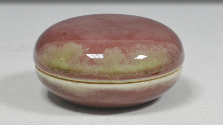 这件清康熙豇豆红釉印盒,在桃花般红色的釉面上泛出青色苔点,被形容为:“满身苔点,泛于桃花春浪间”。