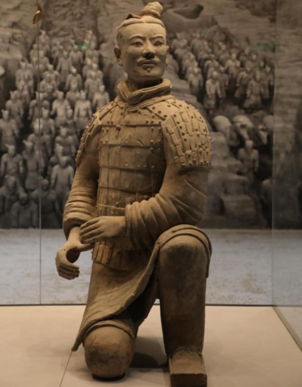 秦始皇帝陵博物馆国宝兵马俑也来到了展览现场。跪射俑身穿战袍,外披铠甲,左腿曲蹲,右膝着地,双手置于身体右侧作握弓弩待发状,展现出了秦代将士之勇猛。所持武器为弓弩,与立射俑一起组成弩兵军阵。