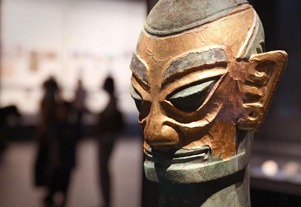 这是在中国百年百大考古发现展上展出的“戴金面罩青铜人头像”(9月4日摄) 新华社记者 李安/摄