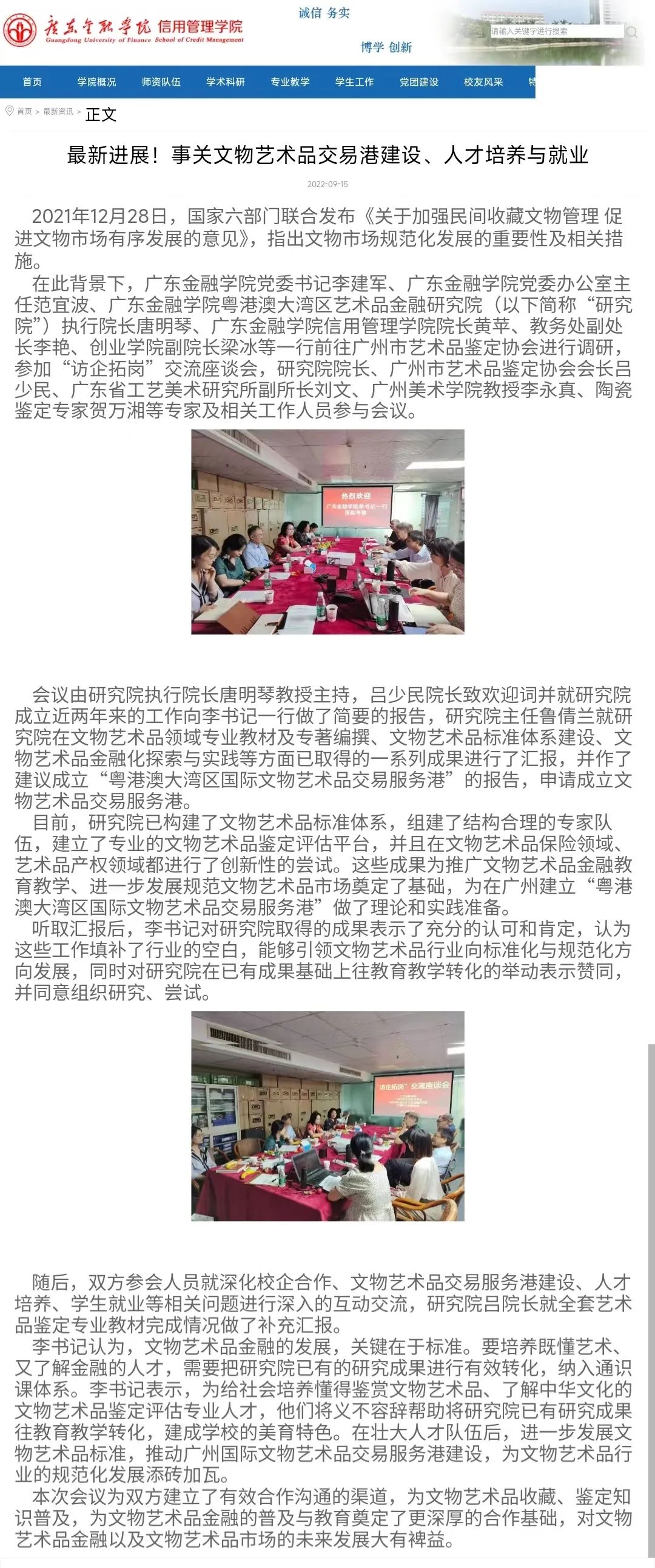 近日,广东金融学院对校党委书记李建军率队赴广州市艺术品鉴定协会走访调研一事高度重视,学校官网及相关院系对此次调研活动发布了重要报道。