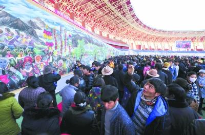 -拉萨市民在观赏大型传统国画《中国梦·西藏行——大美西藏》-