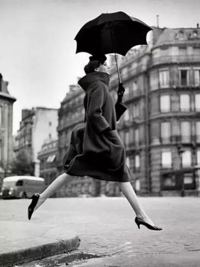 -阿威登1957年拍摄的时髦女郎手持雨伞跳跃于巴黎街道的时尚名作-