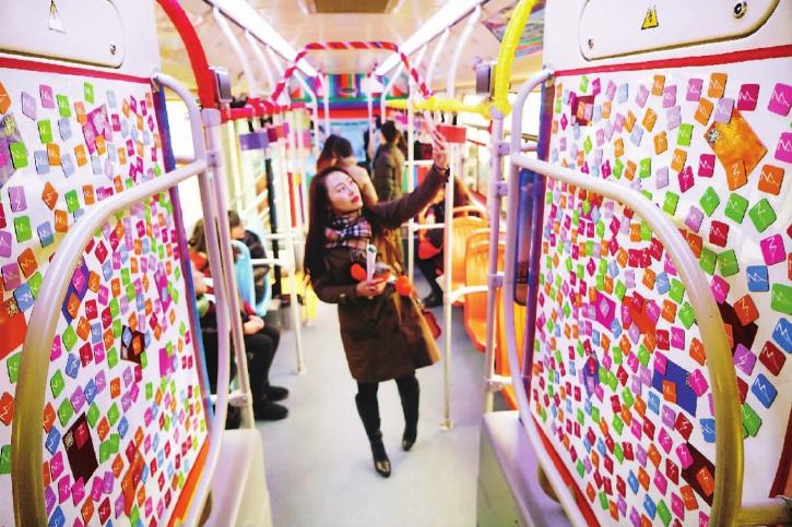 1.由英国艺术家和南京艺术学院学生联手打造的“35路声音美术馆”公交车日前从南京艺术学院启程发车,驶入日常运营路线,开启了城市公交艺术之旅。
