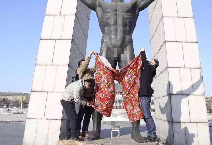 二、长春文化广场的“裸男”雕塑被一群长春的年轻人穿上东北花色七分裤,他们表示,这不是“恶搞”而是行为艺术。