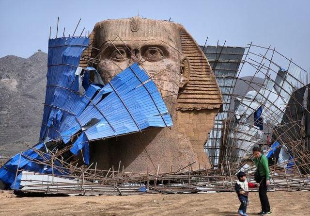三、近日,在位于石家庄市长城影视基地内,曾一度引起争议的山寨版“狮身人面像”建筑被拆分,身首分离,头部与躯体分别用蓝色挡板和黑色纱布围挡。该山寨版“狮身人面像”于2014年建造,身长约60米,高约20米,几乎与古埃及的狮身人面像同比例建造而成