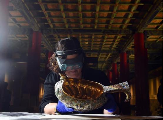 -工作人员查看一款准备展出的画珐琅水盛器-