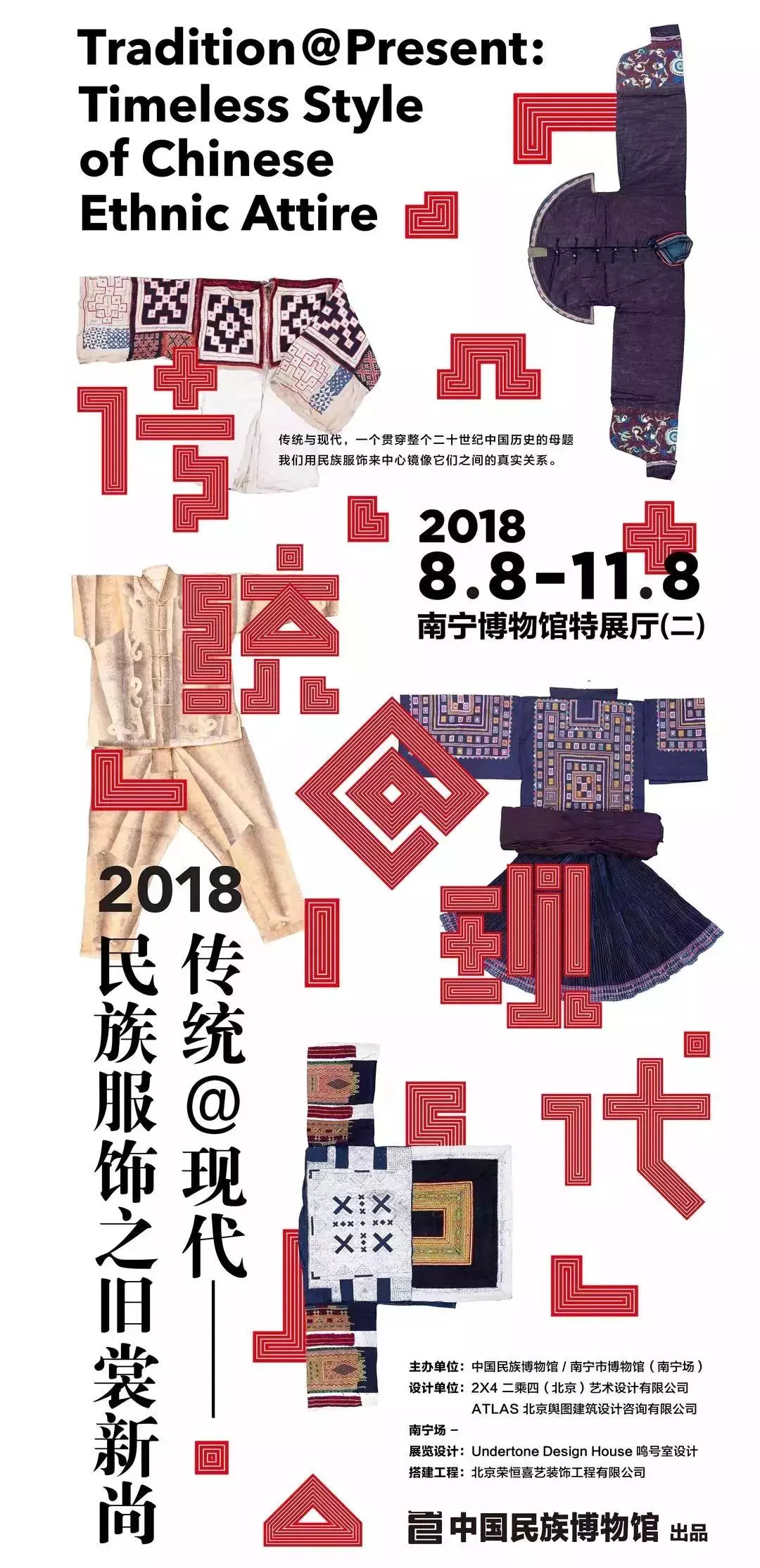 “传统@现代--民族服饰之旧裳新尚展”于2018年8月8日至2018年11月8日在南宁博物馆特展厅(二)举行。展览空间创意性地采用了装置与陈列并行的方式,将场景、设计、文字、展品融为一体,与空间设计师共同传达策展理念,从而,这场展览将带领观众体验传统与现代之间的美学融通与精神互联。