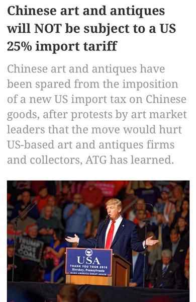 特朗普(Trump)政府推出的2000亿美元中国商品的10%关税,到2019年将升至25%。只要原产于中国无论从世界任何港口出口的艺术品和古董,连同食品、兽皮、技术、建材、化学品和其他中国产品,注定要征税。2018年7月10日公布的原始关税清单包括中国画、油画、粉彩画、版画和石刻、原始雕塑以及“100多年古董”。而在9月17日星期一公布的中国进口货物关税修订清单上,艺术品和古董不再出现。对于内地拍卖市场的发展,放弃对艺术品古董征税避免使国人到美国购藏中国文物的欲望衰减,也避免了将在美国买到的中国文物留在美国,藏于香港或放到内地的保税区。从美国回流的文物仍然可以进入拍卖场,不会受到关税的影响。这对于两国艺术界之间的交流是很好的桥梁,这一次成功算得上是两国艺术界的成功。