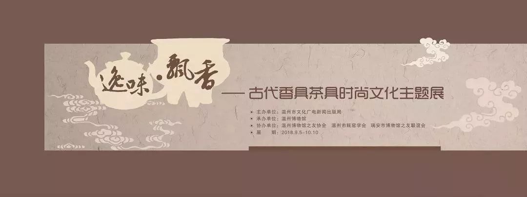 “逸味•飘香--古代香具茶具时尚文化主题展”于2018年9月5日至2018年10月10日在温州博物馆举行。本展览承蒙温州博物馆之友协会会员匡助,因缘汇聚香具、茶具为时尚文化主题展。本展旨在惟精惟美,推陈出新,以期较为全面地展现我国古代人们的聪明才智,尤其是文人士大夫焚香饮茶的生活状态与精神追求,提倡时尚、绿色、可持续发展的物质文化生活。