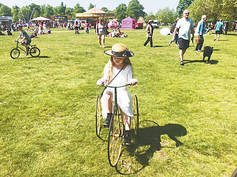近日,记者在伦敦西郊泰丁顿一个公园就偶遇一个古董自行车展。65岁的凯瑟琳和同龄人乔治、托马斯等都是“老兵自行车俱乐部”成员,他们趁着公共假期,在公园绿地上,将收藏的十几辆古董自行车拿出来展览。