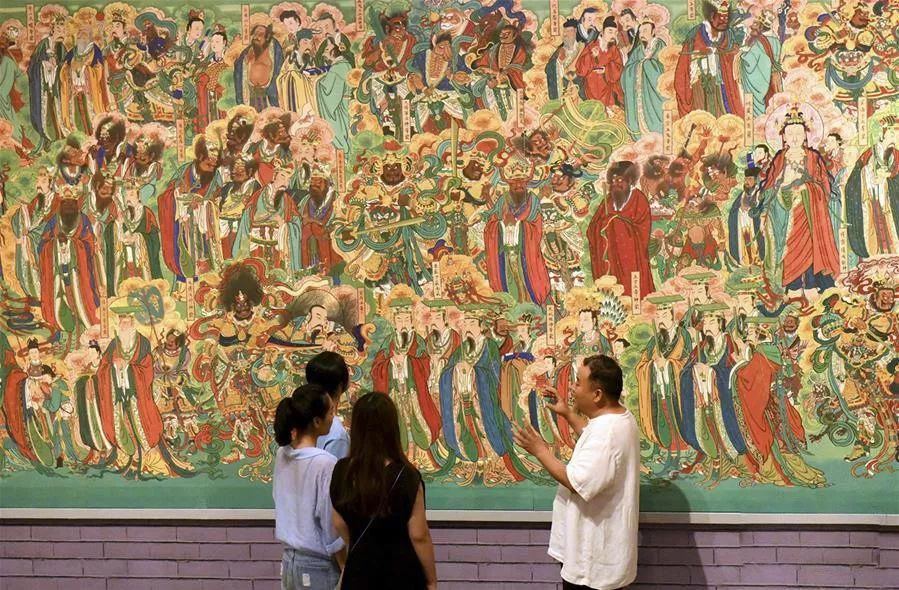 7月25日,在河北博物院,姚淑龙在自己的临摹作品前为游客介绍毗卢寺壁画。 石家庄民间画家姚淑龙,6岁时随父亲参观位于河北省石家庄市的毗卢寺,从此便与毗卢寺壁画结下不解之缘。2006年他开始临摹复制毗卢寺壁画,经过10年潜心绘制,运用白描、上色、沥粉贴金等技法,将200多平方米的古代壁画按原比例再现于纸上。近两年,姚淑龙通过办展览、校园讲座等形式推广中国传统壁画,让更多人了解这门精美的古代艺术。