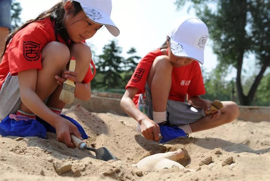 7月24日,牦牛坪小学学生在大明宫考古探索中心模拟考古现场清理文物复制品。 当日,20名来自云南省永胜县东山乡牦牛坪小学的学生,在陕西西安大明宫国家遗址公园开始了为期一周的“我是小小考古家”公益活动。他们在专业考古人员的指导下,模拟考古现场,体验科技工具,学习历史知识。