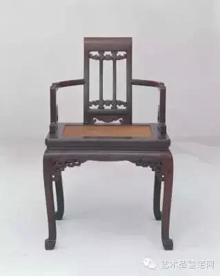 这个扶手椅样式大气。首先为栅栏式背板,背板过肩处凸起形成搭脑。板框中雕上下两组云纹,下接座面处有云纹亮脚。靠背两肩向前兜转,至扶手处下转,卷成回纹。席心座面。鱼肚形牙板,两角有镂空拐子纹托角牙。四腿内收,外翻马蹄。此椅整体虽为明式风格,但细部装饰已显露清式风格之端倪。