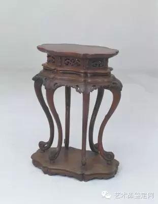 上图这件为香几黄花梨木质。几面荷叶式,下束腰甚高,分上下两层,两层皆分为6段装绦环板和托腮,上层绦环板中央饰开光透雕卷草纹,下层则开长条形孔洞。牙子雕成花叶形分段相接,似披肩般覆盖着几腿,与插肩榫的做法不同,几腿下半部弯转度极大,足下承以圆珠,圆珠落在台座上。此香几采用格调清新淡雅的黄花梨木为材,雕饰精湛传神,造型颇见匠心,是一件不可多得的明代家具珍品哦。