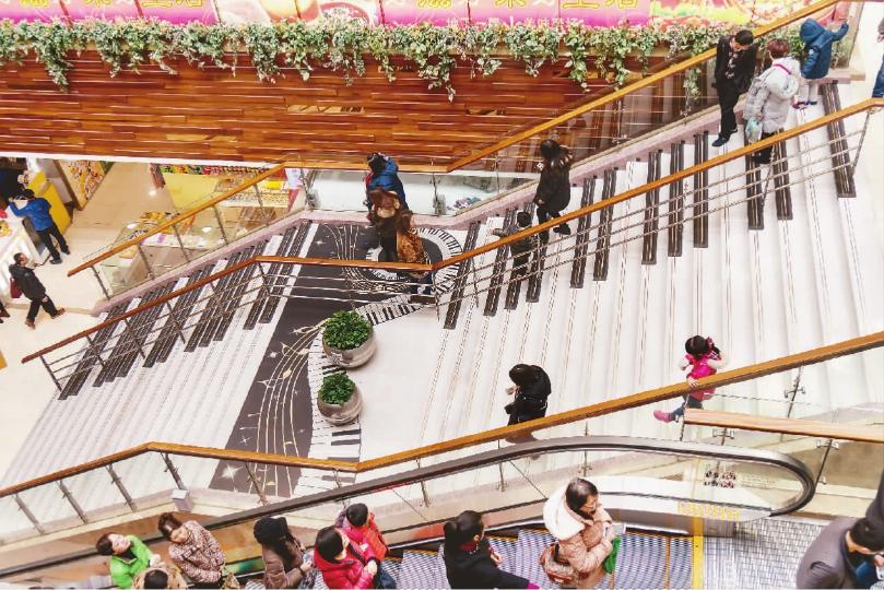 二、近日,两段共34级“钢琴阶梯”出现在上海浦东新区一商场内,这片台阶被粉刷成钢琴键的黑白两色,中间休息平台还有音符图案装饰,阶梯的每一个台阶上都设有红外感应装置,市民走上任意一个台阶都会对应“弹出”一个悦耳的钢琴声。