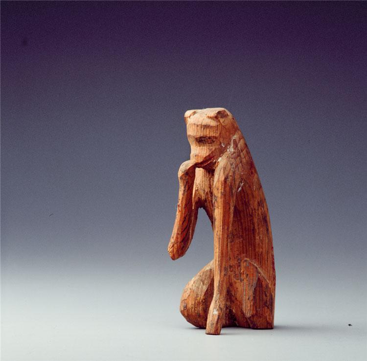 此猴作跪坐状,头微低,左前肢垂直撑地,右前肢上屈至口。雕塑用黑、红两色彩绘,形体小巧,刀法简练,将一只调皮的猴子微感惶惑的瞬间神态刻画入微。雕刻方法先是砍削出俑的外部和简约的动态,然后对富于特征的细节进行精细刻画,艺术上虚与实的关系处理的恰到好处。