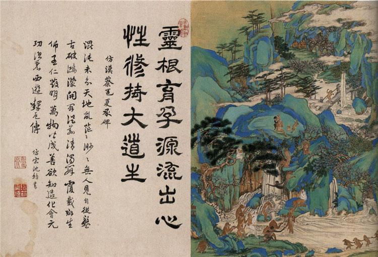 图册计两册,折叠式装裱,封面为花卉锦面,左上泥金笺,上书“证道图”三字,并注明册序。每册二十开,半开图画,半开文字,根据《西游记》一至二十回故事绘制。每二开绘同一回故事不同的两个场景,一开题写每回标题,一开书写点评,书体各异。上册第二开点评旁楷书“癸未秋八月朔”,下册末开款署“癸未十二月十八日,海宁陈奕禧题第二册”,钤“陈奕禧”、“放浪形骸之外”二印,因知图册书写者是陈奕禧。