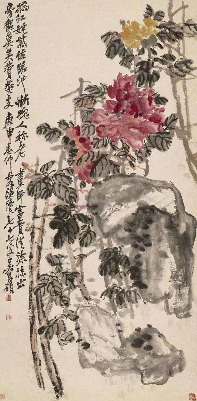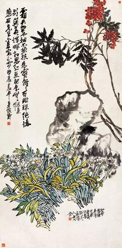 吴昌硕五十岁前也画荷花,但都是小幅画,至50岁后才开始画大幅的荷花,此时其创作力有爆发之势,作藤本花卉,气势奔放,放情横扫,行笔如写篆书。60岁之后,他已擅长各种题材的绘画,山水、花卉都画。