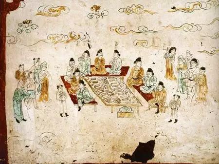 这一时期的饮食,饮食品种增加,主食有饼、饭、粥、糕等,副食更为丰富;烹调方法仍以蒸、煮、烙、烧、煎、炸、烤为主。生活家具有床、榻、几、案、橱、柜等。床和榻都有用于坐和卧的两类,胡床是从少数民族引进的,可折迭。几、案、挟轼都是传统的家具,几发展为凭几、挟轼,用于身体前伏或侧身依靠。几放在席上供依凭,案是架东西或茶、酒、食物的,有短腿、长腿之分,长腿案即是桌子的雏形。唐墓和敦煌壁画中已有高脚桌、椅和图像。现在的我们看着当时聚餐的情景,不禁感叹唐代人在享受生活方面也不会亏待自身。