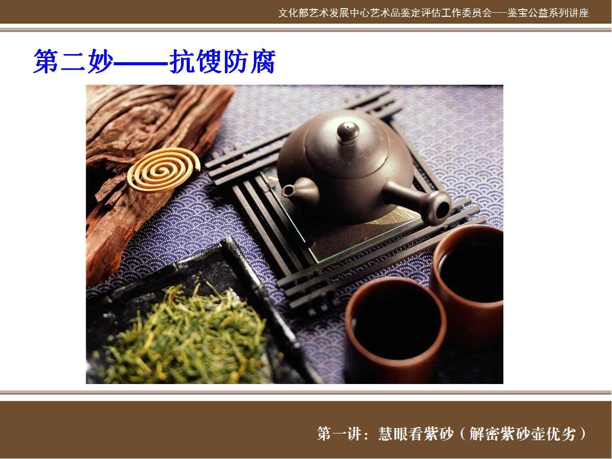 抗馊防腐,当为紫砂壶的第二妙。较之于其他材质,紫砂有一个特点,叫透而不漏。它具有很好的透气性,但又不漏水。举个不恰当的例子,你们要是戴手套,真皮手套戴一天也不出手汗,你戴人造革手套,半天下来手套里是湿漉漉的,因为人造革不透气。我们用透而不漏的紫砂做壶,它就具有抗馊防腐的功能。